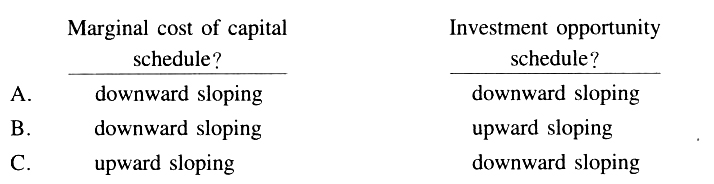 答案解析:投资机会线(investment opportunity schedule)是一条向下倾斜的曲线,代表投资收益率从大到小进行排列,随着投资金额的不断扩大,投资收益率会不断下降。边际成本线(marginal cost of capital)是一条向上倾斜的曲线,代表随着融资规模的不断扩大,融资的边际成本会不断增加。