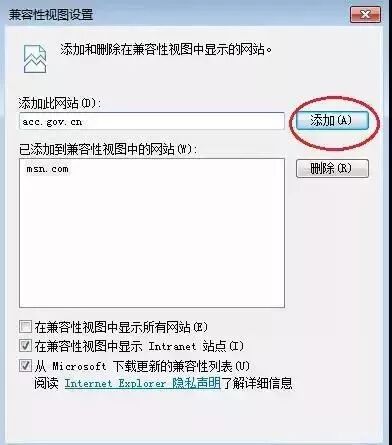 系统打开如下图所示的兼容性视图设置,点击添加按钮即可把当先网站添加到兼容性视图模式: