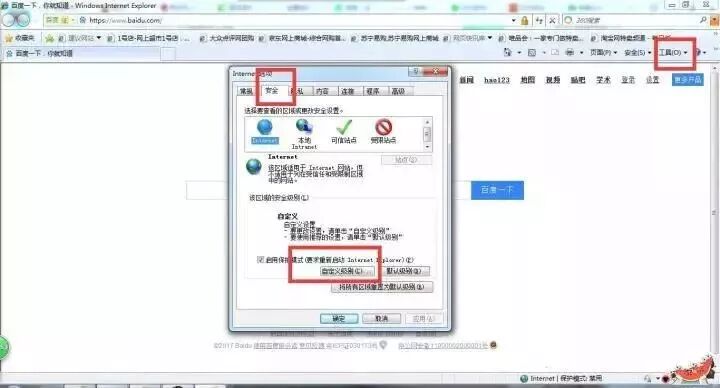 ①打开IE浏览器点击【工具】—【Internet选项】—【安全】—【Internet】—【自定义级别】;