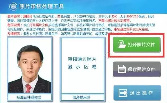 因此,报考人员须准备标准证件数字照片(白色背景,JPG格式,大于10KB,像素大于等于295*413),下载照片审核处理工具,按照规定要求,对报名照片格式进行预处理,通过审核后再进行上传,以免影响后续报名操作。